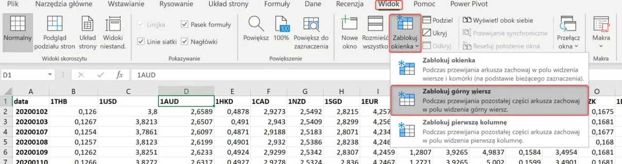 | Zablokuj górny wiersz | Blokuje tylko pierwszy wiersz arkusza | Idealne dla prostych tabel z nagłówkami |