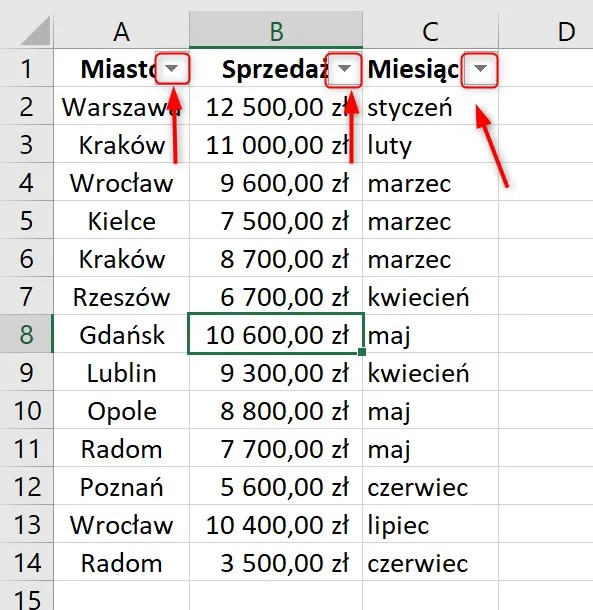 - Strzałki w nagłówkach kolumn umożliwiają elastyczne filtrowanie