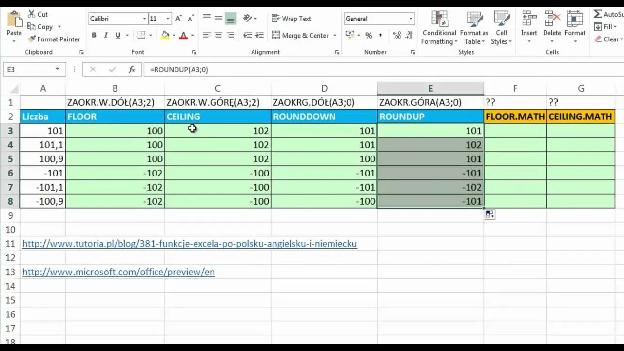 | ZAOKR.UP | Zaokrągla liczbę w górę do najbliższej wielokrotności | ZAOKR.UP(1264,556; 0) = 1265 |
